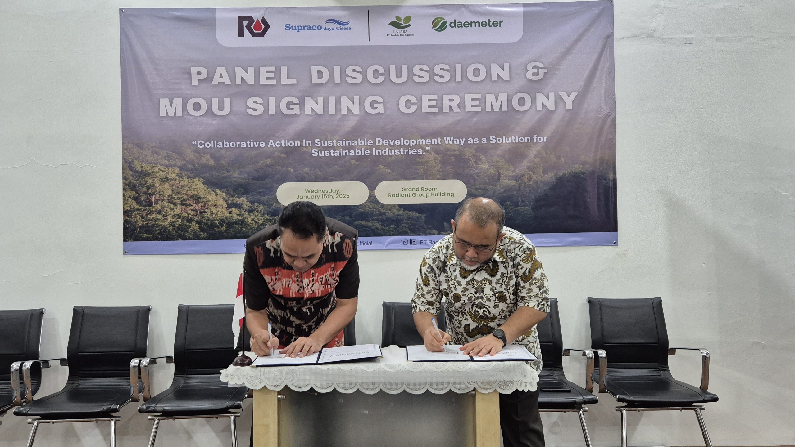 Jakarta, 15 Januari 2025 – Dalam langkah strategis untuk mendukung pembangunan berkelanjutan melalui pendekatan Nature-based Solutions (NbS), PT Supraco Daya Wisesa (SDW), yang merupakan bagian dari Radiant Group, bersama dengan Daemeter Consulting dan PT Lembata Hira Sejahtera (“BATARA”), telah resmi menandatangani Nota Kesepahaman (MoU) pada hari Rabu, 15 Januari 2025 yang diselenggarakan di Grand Room, Radiant Group Building, Jakarta.